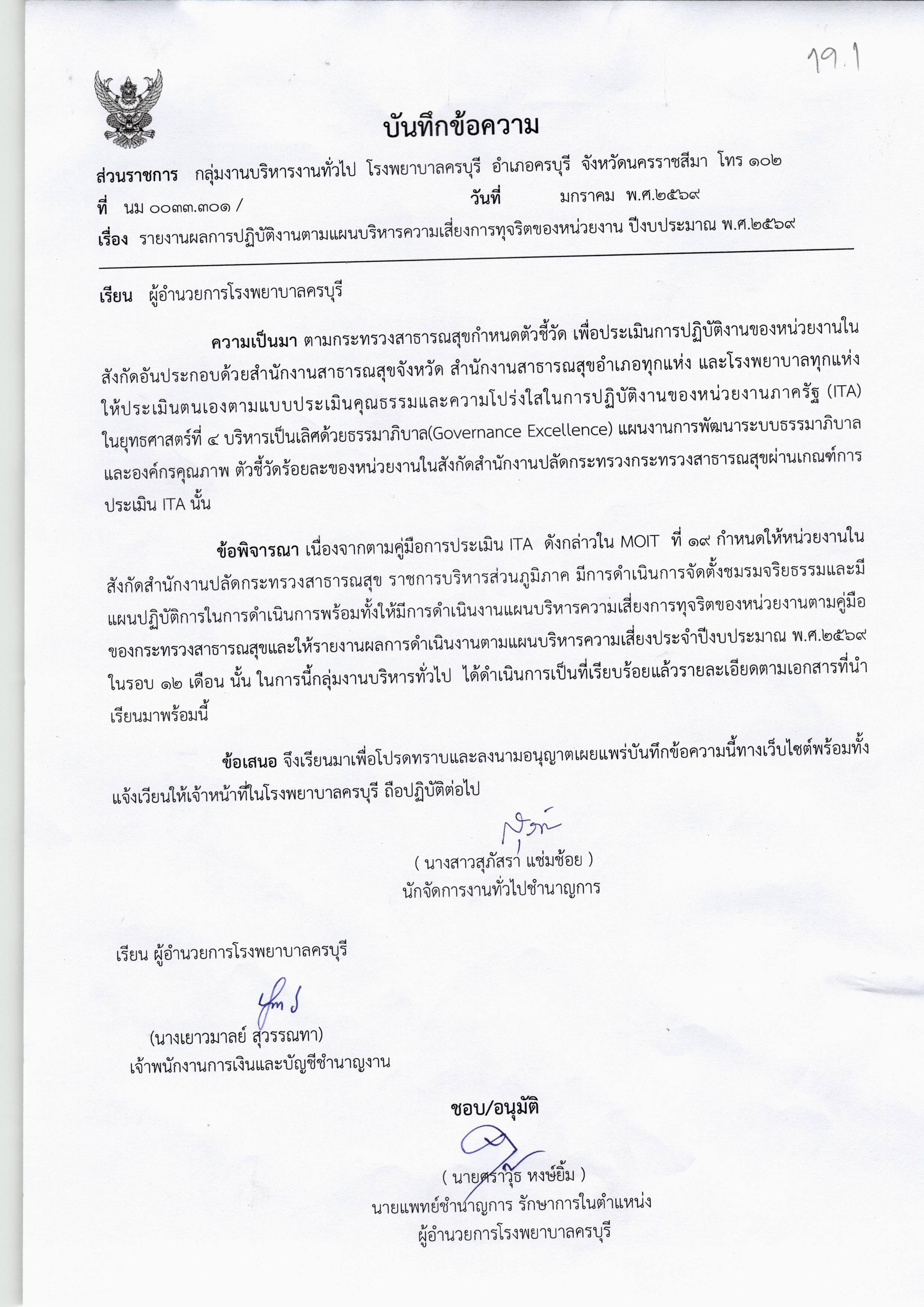 1.1 มีบันทึกข้อความ ที่ผู้บริหารลงนามรับทราบรายงานผลการดำเนินงานตามแผนปฏิบัติการป้องกัน ปราบปรามการทุจริตและประพฤติมิชอบของหน่วยงานประจำปีงบประมาณ พ.ศ. 2569 รอบ 12 เดือน และมีการขออนุญาตนำไปเผยแพร่บนเว็บไซต์ของหน่วยงาน ดาวน์โหลด